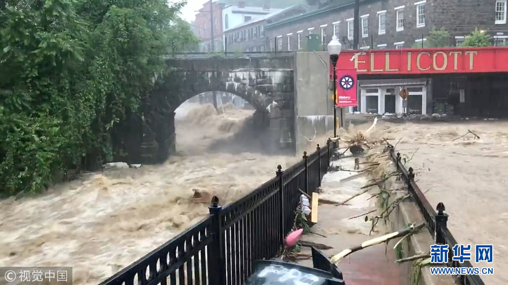 ?。ㄒ曨l截圖)5月27日,美國(guó)馬里蘭州埃利科特城遭洪水侵襲。(圖片來(lái)源:視覺中國(guó))