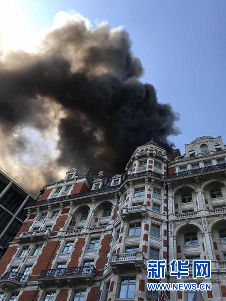 這是6月6日在英國倫敦騎士橋附近拍攝的起火的文華東方酒店。新華社發(fā)(鄧漢聲攝)