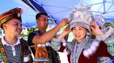 6月8日,在美國洛杉磯,江玥的父親江勇(前左)和表姐徐翔與媒體見面。新華社發(fā)(趙漢榮攝)