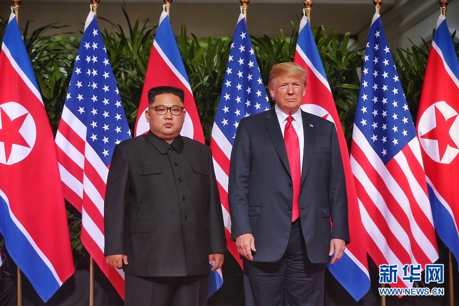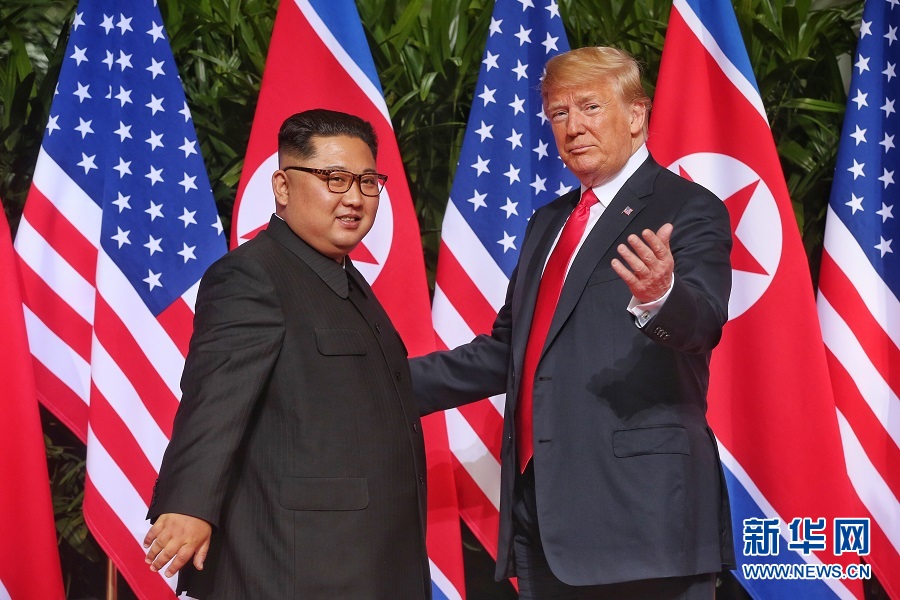 6月12日,朝鮮最高領(lǐng)導(dǎo)人金正恩(左)與美國總統(tǒng)特朗普在新加坡舉行會晤。 新華社發(fā)(新加坡海峽時報供圖)
