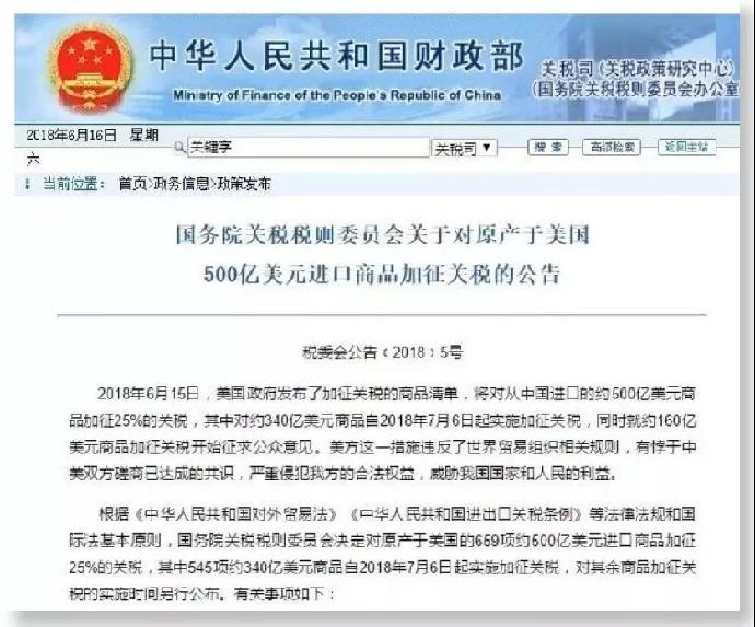 今天凌晨(16日),中國國務(wù)院關(guān)稅稅則委員會發(fā)布公告決定,對原產(chǎn)于美國的659項約500億美元進口商品加征25%的關(guān)稅。委員會辦公室有關(guān)負責(zé)人還表示,中方注意到,美方發(fā)表聲明稱,如果中國采取報復(fù)性措施,美國將繼續(xù)追加額外關(guān)稅。對此,中國將保留采取相應(yīng)措施的權(quán)利。