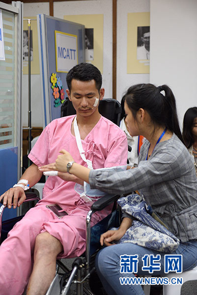 7月9日,在泰國普吉島的哇集拉醫(yī)院,一名華人志愿者(右)指導(dǎo)中國受傷游客活動手指關(guān)節(jié)。新華社記者 秦晴 攝