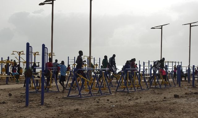 2018年7月18日,塞內(nèi)加爾首都達(dá)喀爾,當(dāng)?shù)孛癖娫跒I海大道健身公園內(nèi)鍛煉。(新華社記者賴向東攝)
