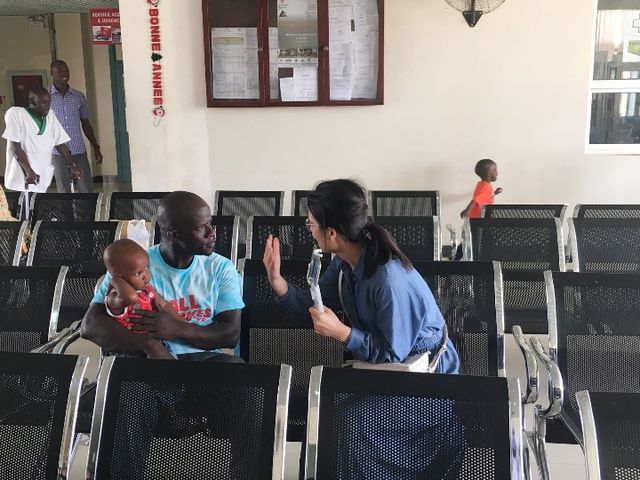 2018年7月18日,中國援建塞內(nèi)加爾兒童醫(yī)院候診室,蘇利曼·費(fèi)迪奧爾抱著孩子接受記者采訪。(新華社記者蔣國鵬攝)