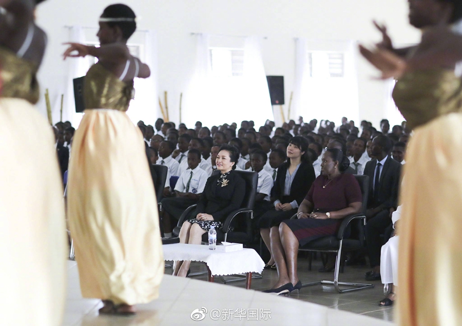 23日上午,國(guó)家主席習(xí)近平夫人彭麗媛參觀了盧旺達(dá)法維女子中學(xué)。全校師生聚集在學(xué)校大禮堂,歡迎中國(guó)貴賓到來。當(dāng)彭麗媛走進(jìn)會(huì)場(chǎng)時(shí),掌聲雷動(dòng)。同學(xué)們?yōu)榕睇愭鲁噬狭艘粓?chǎng)精彩演出:學(xué)校校歌合唱高亢激昂、中國(guó)經(jīng)典名曲《茉莉花》悠揚(yáng)嘹亮、盧旺達(dá)民族舞蹈熱情奔放。彭麗媛不斷為學(xué)生的出色表演鼓掌。演出結(jié)束后,彭麗媛向?qū)W校贈(zèng)送了一批教學(xué)用品,祝愿學(xué)校越來越好。一位同學(xué)向彭麗媛贈(zèng)送了一幅自己專門創(chuàng)作的畫像。彭麗媛高興地接過畫像大加稱贊,親吻這位同學(xué)的臉頰,并同她親切擁抱。彭麗媛對(duì)全校師生的熱情接待表示感謝。