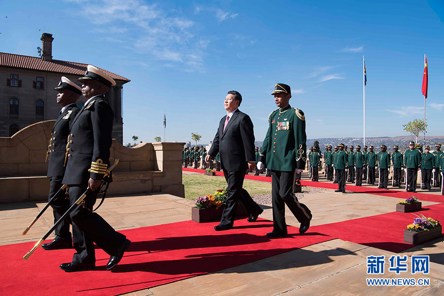 總統(tǒng)府前廣場(chǎng),微風(fēng)拂面,陽(yáng)光和煦。中南兩國(guó)國(guó)旗迎風(fēng)飄揚(yáng)。習(xí)近平和夫人彭麗媛受到拉馬福薩和夫人莫采佩熱情迎接。兩國(guó)元首夫婦登上檢閱臺(tái)。儀仗隊(duì)行持槍禮。軍樂(lè)隊(duì)奏中國(guó)國(guó)歌?,F(xiàn)場(chǎng)鳴放21響禮炮。習(xí)近平檢閱儀仗隊(duì)。軍樂(lè)隊(duì)奏南非國(guó)歌。習(xí)近平和彭麗媛同南方主要官員握手。拉馬福薩夫婦同中方陪同人員握手。兩國(guó)元首夫婦親切寒暄。拉馬福薩對(duì)習(xí)近平在南中建交20周年之際訪問(wèn)南非并出席金磚國(guó)家領(lǐng)導(dǎo)人會(huì)晤表示熱烈歡迎。