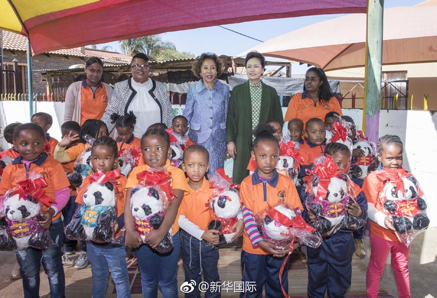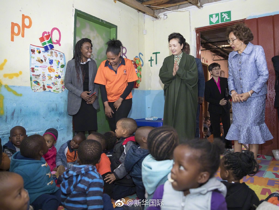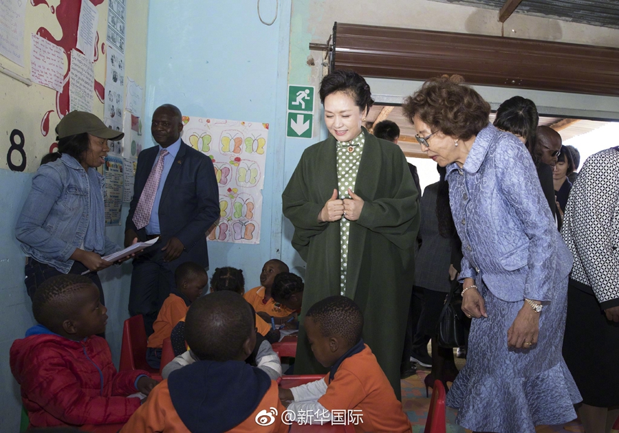 國(guó)家主席習(xí)近平夫人彭麗媛24日上午在南非總統(tǒng)夫人莫采佩陪同下,參觀位于比勒陀利亞?wèn)|郊的烏坦多社區(qū)托兒所。托兒所門外數(shù)十名當(dāng)?shù)貎和瘬]舞著中南兩國(guó)國(guó)旗歡迎彭麗媛,彭麗媛俯身與孩子們親切握手問(wèn)候。彭麗媛來(lái)到托兒所庭院,20多名兒童手持兩國(guó)國(guó)旗,用中英文呼喊“歡迎歡迎”,彭麗媛走上前去同孩子們交流。落座后,南非總統(tǒng)夫人莫采佩表示,這是第一次有外國(guó)元首夫人到訪這里,非常感謝,您的到訪對(duì)我們來(lái)說(shuō)有特殊意義。庭院里,當(dāng)?shù)貎和癁榕睇愭潞铣恕稓g迎您》等英文歌曲和中國(guó)古詩(shī)兒歌《詠鵝》,“鵝鵝鵝,曲項(xiàng)向天歌。白毛浮綠水,紅掌撥清波”,孩子們伴著輕快活潑的舞蹈,盡情歡唱。彭麗媛仔細(xì)聆聽(tīng),不時(shí)點(diǎn)頭贊許、鼓掌,并稱贊說(shuō),你們的中文歌唱得很好、很清楚。從小學(xué)習(xí)中文歌,以后學(xué)習(xí)中文就比較容易了。等你們長(zhǎng)大后,歡迎到中國(guó)去訪問(wèn)。