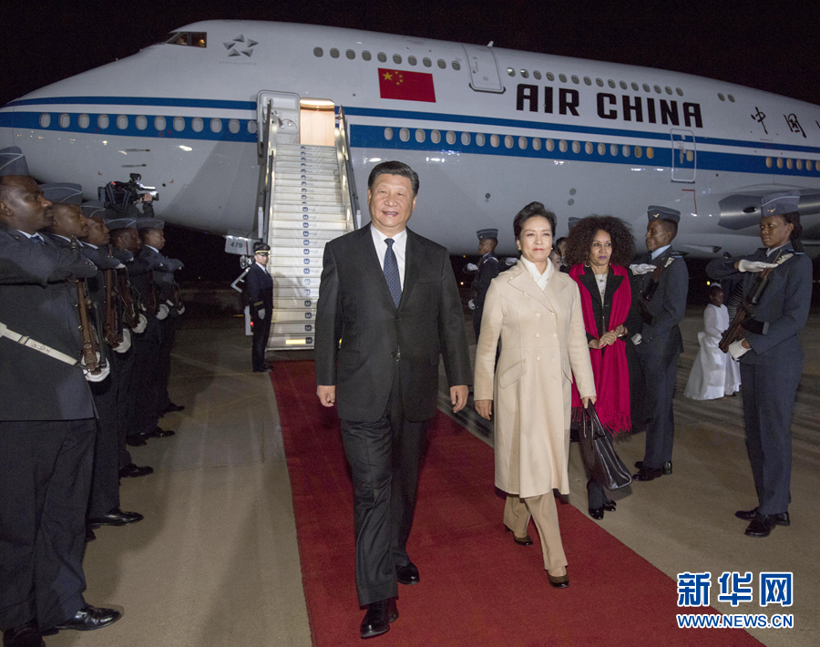 7月23日,國家主席習近平抵達比勒陀利亞,開始對南非共和國進行國事訪問。習近平和夫人彭麗媛在機場受到南非外長西蘇魯?shù)日呒壒賳T熱情迎接。新華社記者李學仁攝