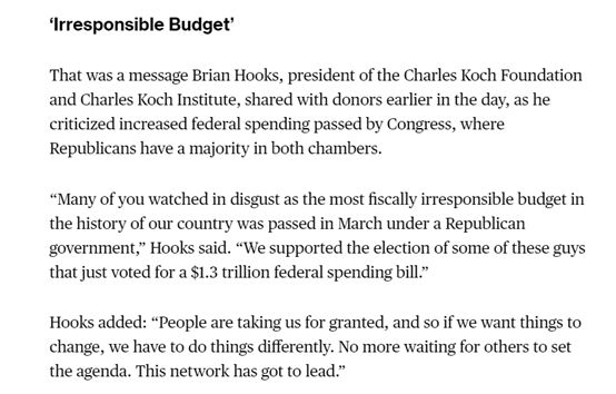 另外,科赫兄弟還表示他們不會再像以前那樣輕易支持共和黨的議員了,因?yàn)檫@些議員并沒有履行他們競選時的承諾,反而是一直在支持美國政府的一些違背市場的政策,比如在今年3月的一項(xiàng)加大政府財政開支的法案。