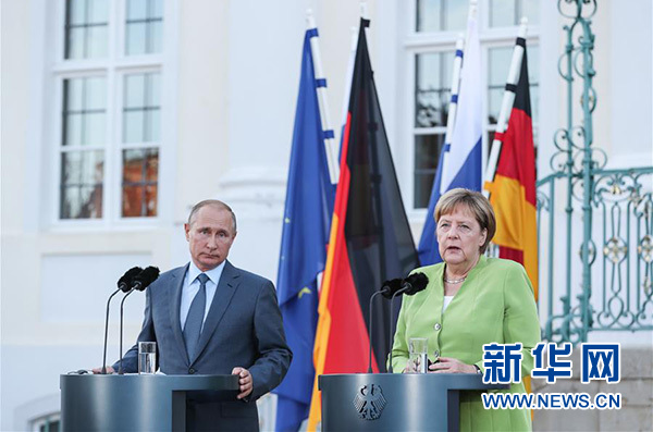 8月18日,在德國首都柏林以北小鎮(zhèn)梅澤貝格,德國總理默克爾(右)與來訪的俄羅斯總統(tǒng)普京共同出席新聞發(fā)布會。當日,德國總理默克爾在梅澤貝格與來訪的俄羅斯總統(tǒng)普京舉行會談,雙方就烏克蘭局勢、敘利亞沖突以及“北溪-2”天然氣管道項目等棘手問題進行討論。新華社記者 單宇琦攝