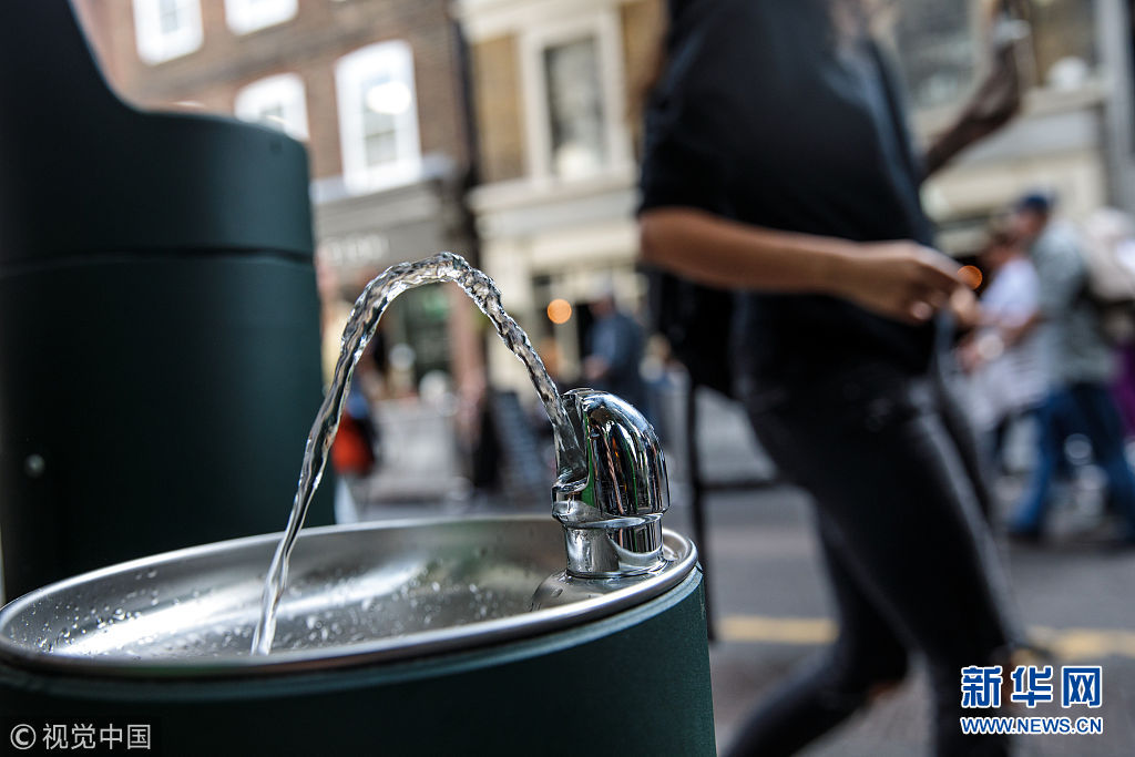 當(dāng)?shù)貢r間2018年8月28日,英國倫敦,民眾在公共飲水機旁飲水。倫敦市長近日引進了20個新的公共飲水機,鼓勵人們自帶杯子取水喝,從而減少塑料垃圾。 (圖片來源:視覺中國)