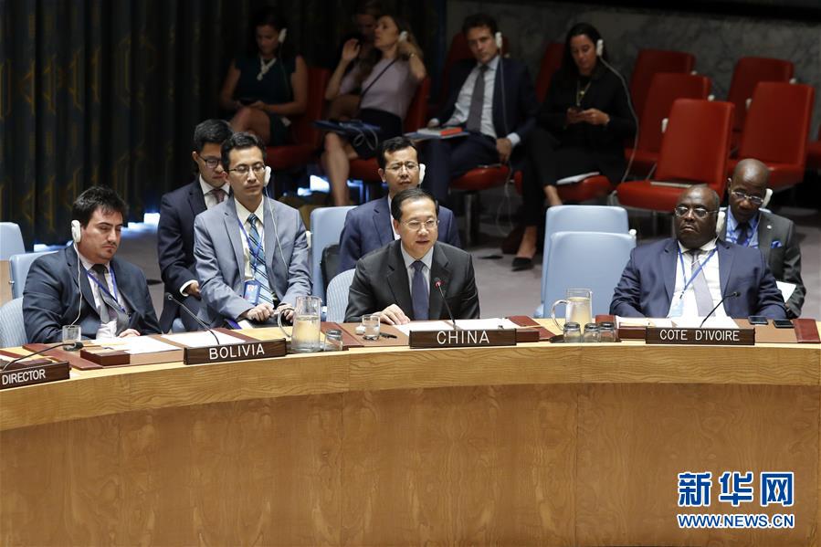 9月6日,在位于紐約的聯(lián)合國總部,中國常駐聯(lián)合國代表馬朝旭(前中)在安理會敘利亞化武問題公開會上發(fā)表講話。新華社記者李木子 攝