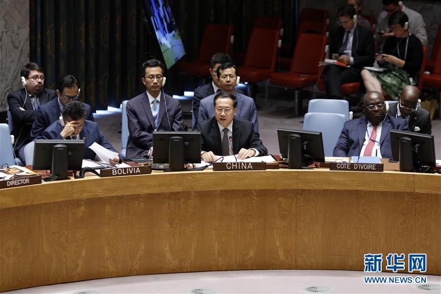 9月7日,在位于紐約的聯合國總部,中國常駐聯合國代表馬朝旭(前排中)在安理會敘利亞問題公開會上發(fā)言。新華社記者 李木子 攝