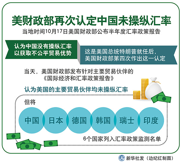新華社華盛頓10月17日電(記者楊承霖 高攀)美國財(cái)政部17日公布半年度匯率政策報(bào)告,認(rèn)為中國沒有操縱匯率以獲取不公平貿(mào)易優(yōu)勢。這是美國總統(tǒng)特朗普就任后,美國財(cái)政部第四次作出這一認(rèn)定。