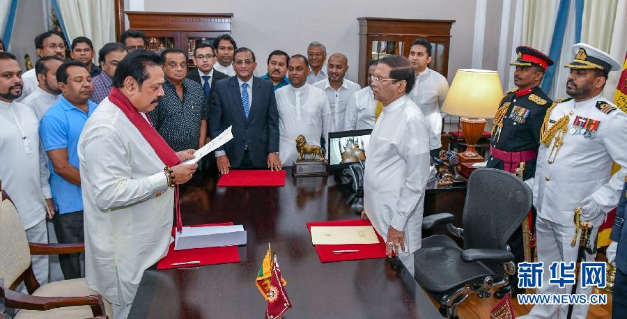 10月26日,在斯里蘭卡科倫坡,斯里蘭卡前總統(tǒng)拉賈帕克薩(前左)宣誓就任總理。 新華社發(fā)(斯里蘭卡總統(tǒng)秘書處供圖)