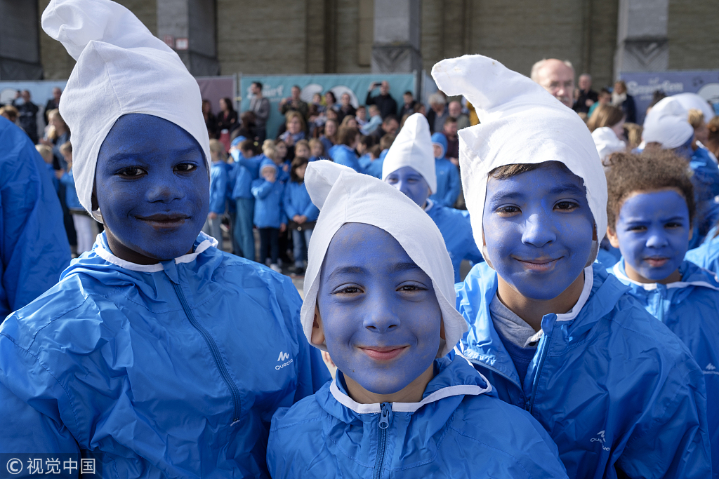 當(dāng)?shù)貢r(shí)間2018年10月23日,比利時(shí)布魯塞爾,民眾參加動(dòng)畫(huà)形象“藍(lán)精靈”60歲慶?;顒?dòng)。(圖片來(lái)源:視覺(jué)中國(guó))