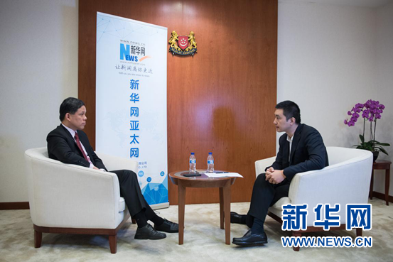 近日,新加坡貿工部長陳振聲在新加坡接受新華網專訪。圖為陳振聲(左)與本次訪談主持人、新華網新加坡負責人吳磊對話。新華網 王應耀 攝
