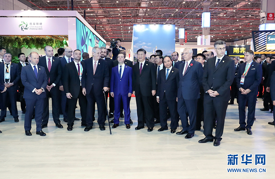 中午,習(xí)近平同外國領(lǐng)導(dǎo)人一同步入國家貿(mào)易投資綜合展展廳。他們邊走邊看,邊看邊談,先后參觀了匈牙利、埃及、英國、捷克、肯尼亞、薩爾瓦多、多米尼加、老撾、格魯吉亞、越南、巴基斯坦、俄羅斯等國展區(qū),了解各國經(jīng)貿(mào)發(fā)展成就和特色優(yōu)勢(shì)產(chǎn)品。習(xí)近平和各國領(lǐng)導(dǎo)人通過視頻欣賞了匈牙利的美麗風(fēng)光、領(lǐng)略了埃及的悠久文明和現(xiàn)代發(fā)展規(guī)劃,共同體驗(yàn)了英國館炫酷時(shí)尚的裸眼3D視頻。在捷克館,澤曼總統(tǒng)用捷克產(chǎn)鋼琴即興演奏一曲,并邀請(qǐng)習(xí)近平品嘗捷克啤酒??夏醽喌孽r花、薩爾瓦多的咖啡、多米尼加的水果,琳瑯滿目的各國特色產(chǎn)品吸引中外領(lǐng)導(dǎo)人頻頻駐足。格魯吉亞總理和越南總理親自向習(xí)近平推介本國農(nóng)產(chǎn)品和旅游項(xiàng)目。老撾館的中老鐵路項(xiàng)目沙盤和巴基斯坦館的中巴經(jīng)濟(jì)走廊展板分別展現(xiàn)了中老、中巴共建“一帶一路”、實(shí)現(xiàn)共同發(fā)展的美好愿景。在俄羅斯館,習(xí)近平在梅德韋杰夫總理陪同下聽取中俄在核電、天然氣、飛機(jī)制造、地方交往等領(lǐng)域合作成就介紹,共同展望中俄合作的廣闊前景。