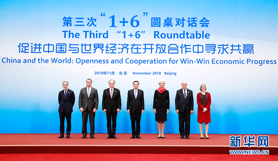 新華社北京11月6日電(記者鄭明達(dá))國務(wù)院總理李克強(qiáng)6日下午在釣魚臺國賓館同世界銀行行長金墉、國際貨幣基金組織總裁拉加德、世界貿(mào)易組織總干事阿澤維多、經(jīng)濟(jì)合作與發(fā)展組織秘書長古里亞、金融穩(wěn)定理事會主席卡尼和國際勞工組織副總干事格林菲爾德舉行第三次“1+6”圓桌對話會。會議圍繞“促進(jìn)中國與世界經(jīng)濟(jì)在開放合作中尋求共贏”的主題,就中國經(jīng)濟(jì)和改革開放等議題深入交流。
