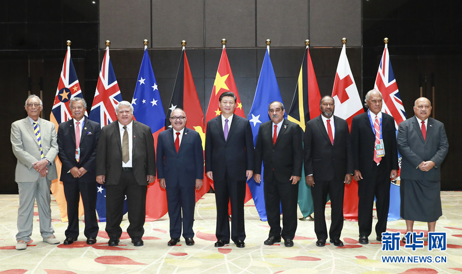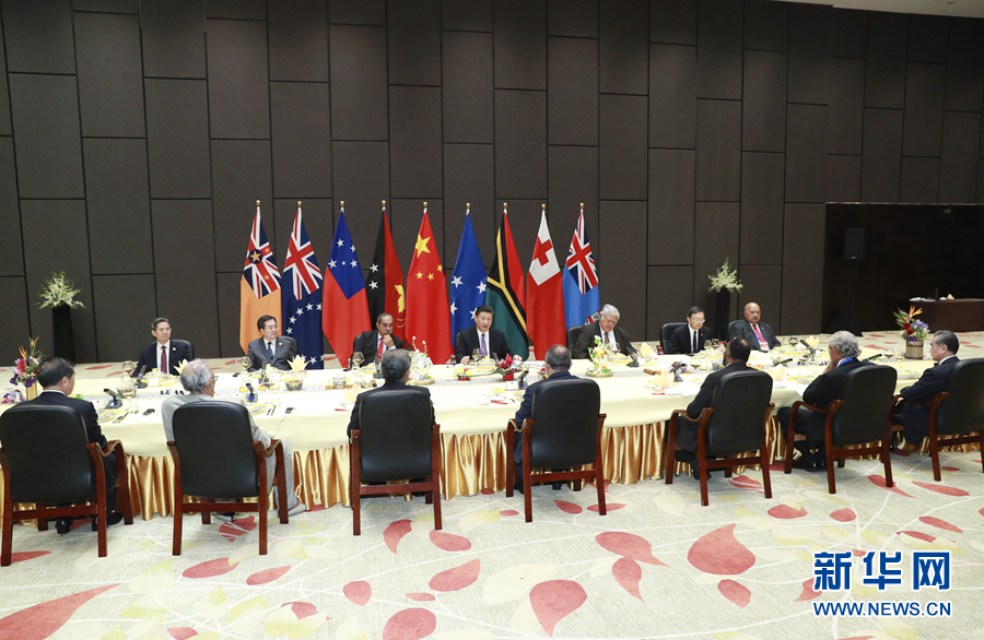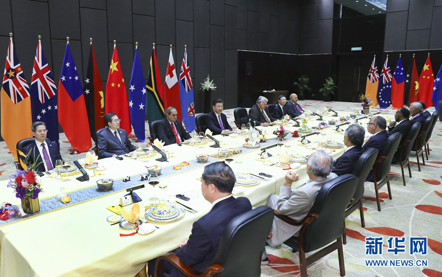 11月16日,國家主席習(xí)近平在莫爾茲比港同巴布亞新幾內(nèi)亞總理奧尼爾、密克羅尼西亞聯(lián)邦總統(tǒng)克里斯琴、薩摩亞總理圖伊拉埃帕、瓦努阿圖總理薩爾瓦伊、庫克群島總理普納、湯加首相波希瓦、紐埃總理塔拉吉等建交太平洋島國領(lǐng)導(dǎo)人以及斐濟(jì)政府代表、國防部長(zhǎng)昆布安博拉舉行集體會(huì)晤。習(xí)近平主持會(huì)晤并發(fā)表主旨講話。 新華社記者 謝環(huán)馳 攝