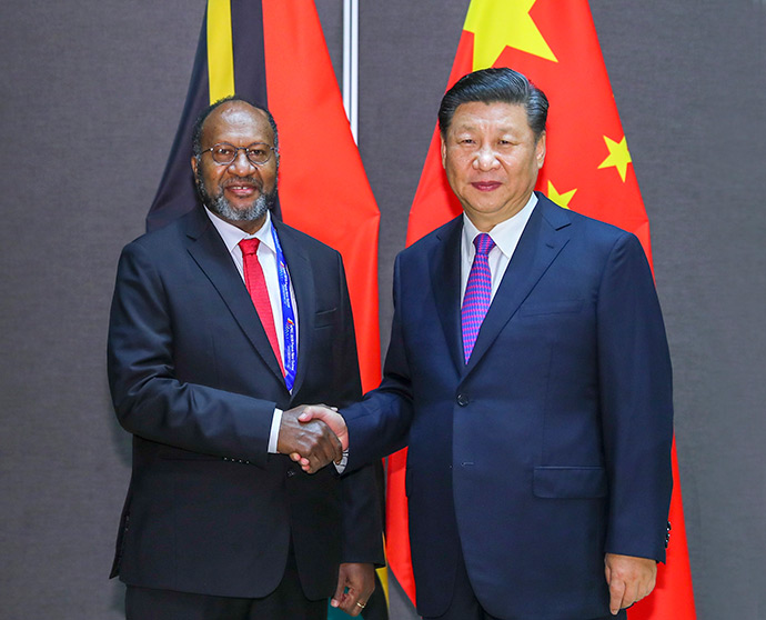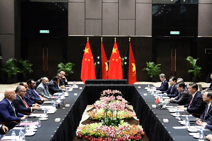 11月16日,國(guó)家主席習(xí)近平在莫爾茲比港分別會(huì)見建交太平洋島國(guó)領(lǐng)導(dǎo)人。這是習(xí)近平會(huì)見紐??偫硭?。新華社記者 丁林 攝