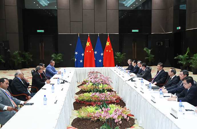11月16日,國(guó)家主席習(xí)近平在莫爾茲比港分別會(huì)見建交太平洋島國(guó)領(lǐng)導(dǎo)人。這是習(xí)近平會(huì)見密克羅尼西亞聯(lián)邦總統(tǒng)克里斯琴。新華社記者 龐興雷 攝