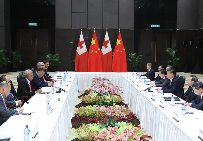 11月16日,國(guó)家主席習(xí)近平在莫爾茲比港分別會(huì)見建交太平洋島國(guó)領(lǐng)導(dǎo)人。這是習(xí)近平會(huì)見湯加首相波希瓦。新華社記者 丁林 攝