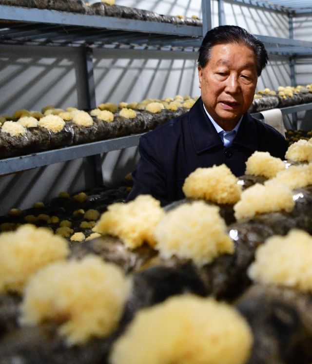 福建農(nóng)林大學(xué)研究員林占熺在查看利用巨菌草碎渣來(lái)培育的菌菇。新華社記者 魏培全 攝
