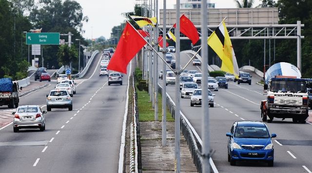 文萊首都斯里巴加灣市道路兩側(cè)掛起中文兩國(guó)國(guó)旗。新華社記者王申攝
