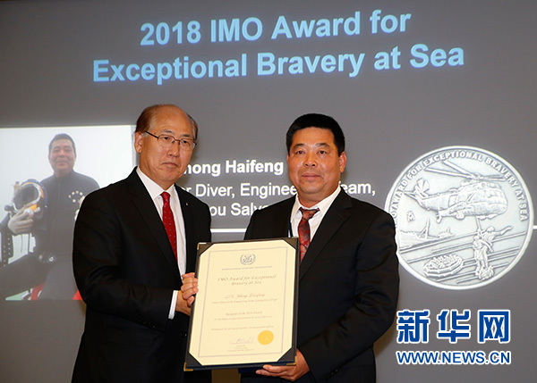 新華社倫敦12月7日電(記者梁希之)中國廣州打撈局高級潛水員鐘海鋒6日晚在倫敦獲得國際海事組織頒發(fā)的2018年度最高獎項——“海上特別勇敢獎”。