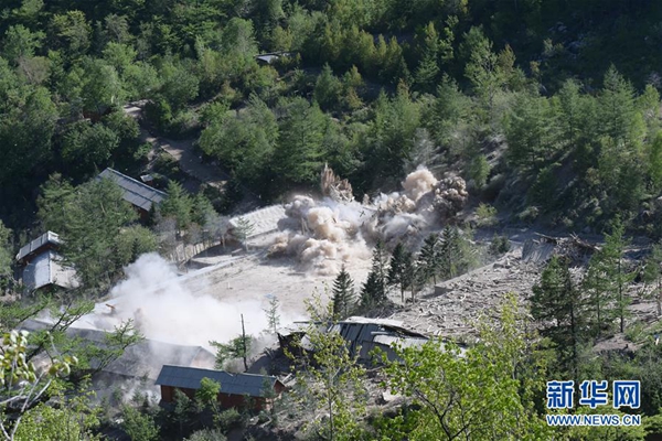 這是5月24日在朝鮮咸鏡北道吉州郡的豐溪里核試驗(yàn)場拍攝的場內(nèi)地面建筑爆破場景。朝鮮24日在豐溪里核試驗(yàn)場對多條坑道和附屬設(shè)施進(jìn)行爆破,并宣布正式廢棄這座核試驗(yàn)場。 新華社記者 程大雨 攝