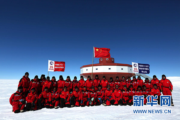 12月26日,中國第35次南極科學考察隊內(nèi)陸隊(泰山隊和昆侖隊)隊員在泰山站主體建筑前升國旗合影。 新華社記者 劉詩平 攝