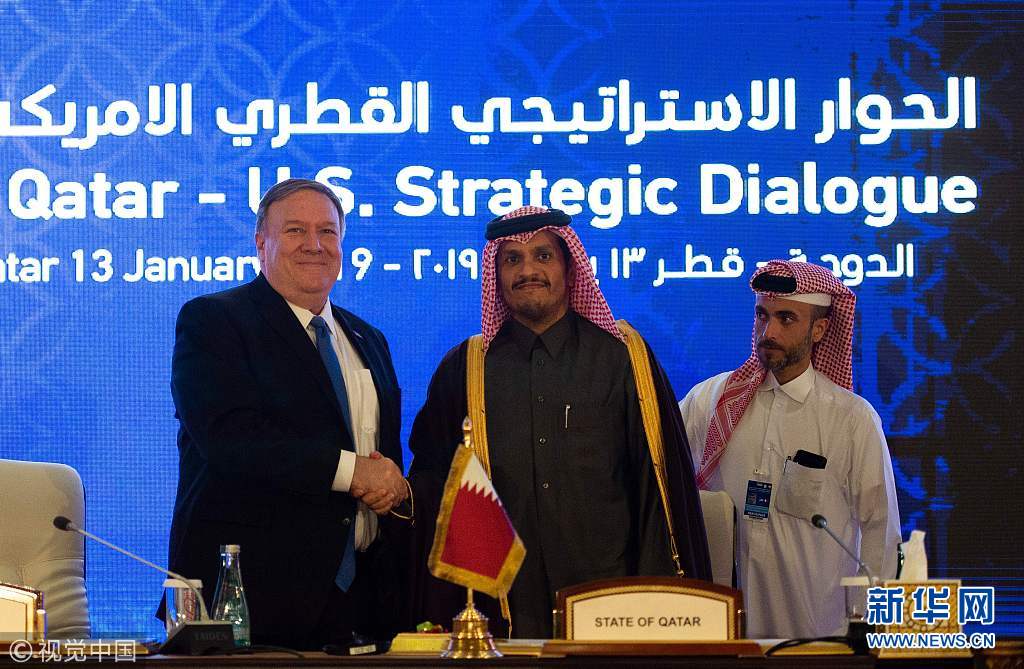 2019年1月13日,卡塔爾多哈,美國國務(wù)卿邁克·蓬佩奧訪問卡塔爾。蓬佩奧與卡塔爾副首相兼外交大臣穆罕默德在多哈的喜來登大酒店簽署了諒解備忘錄和意向聲明并舉行聯(lián)合記者會。蓬佩奧表示,兩國外交部門領(lǐng)導(dǎo)人當天簽署了一份諒解備忘錄,將擴建和改造烏代德美國空軍基地。(圖片來源:視覺中國)