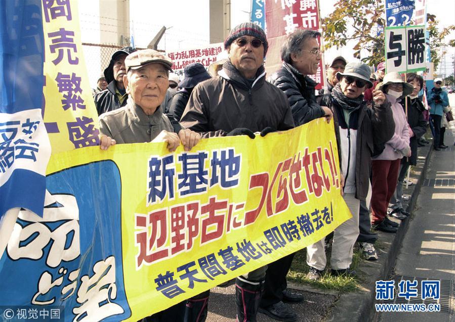 當(dāng)?shù)貢r(shí)間2019年1月26日,日本沖繩縣名護(hù),民眾在美國(guó)海軍陸戰(zhàn)隊(duì)施瓦布軍營(yíng)門前舉行集會(huì),呼吁在2月24日的地方公投中投票反對(duì)美國(guó)海軍陸戰(zhàn)隊(duì)普天間空軍基地的搬遷計(jì)劃。(圖片來(lái)源:視覺(jué)中國(guó))