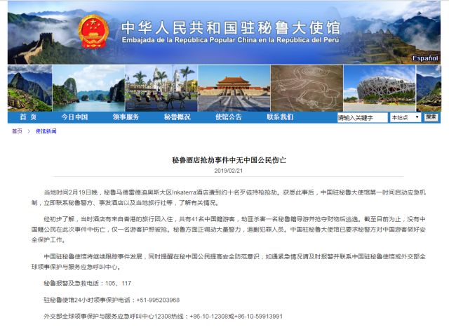 當?shù)貢r間2月19日晚,秘魯馬德雷德迪奧斯大區(qū)Inkaterra酒店遭到約十名歹徒持槍搶劫。獲悉此事后,中國駐秘魯大使館第一時間啟動應急機制,立即聯(lián)系秘魯警方、事發(fā)酒店以及當?shù)芈眯猩绲?,了解有關情況。