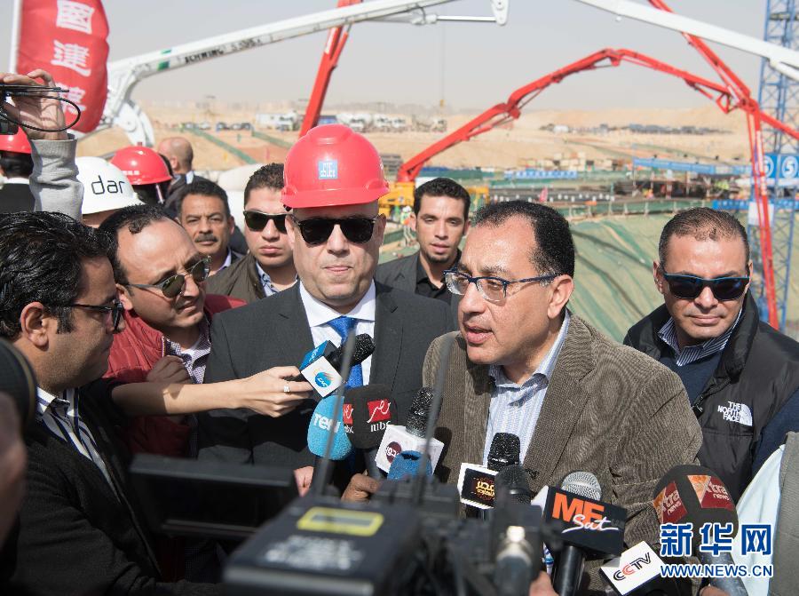 2月25日,在埃及開羅以東約50公里處的新首都中央商務區(qū),埃及總理穆斯塔法·馬德布利(右二)接受媒體采訪。 埃及總理穆斯塔法·馬德布利25日上午視察了由中國建筑股份有限公司承建的埃及新首都中央商務區(qū),并見證了標志塔主樓1.85萬立方米超大型混凝土基礎底板開盤澆筑。埃及新行政首都中央商務區(qū)位于首都開羅以東約50公里處,總占地面積約50.5萬平方米,包含20個高層建筑單體及配套市政工程。 新華社記者鄔惠我攝