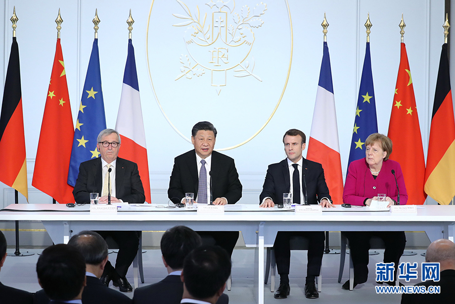 3月26日,國家主席習(xí)近平在巴黎同法國總統(tǒng)馬克龍一道出席中法全球治理論壇閉幕式。德國總理默克爾、歐盟委員會(huì)主席容克應(yīng)邀出席。 新華社記者 鞠鵬 攝