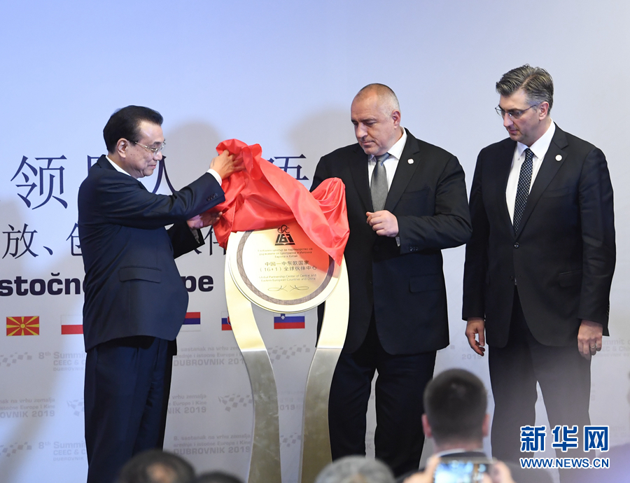 當(dāng)?shù)貢r(shí)間4月12日下午,國(guó)務(wù)院總理李克強(qiáng)在杜布羅夫尼克出席第八次中國(guó)-中東歐國(guó)家領(lǐng)導(dǎo)人會(huì)晤后,與保加利亞總理鮑里索夫、克羅地亞總理普連科維奇共同為“16+1全球伙伴中心”揭牌,宣布“16+1全球伙伴中心”正式成立。新華社記者 申宏 攝