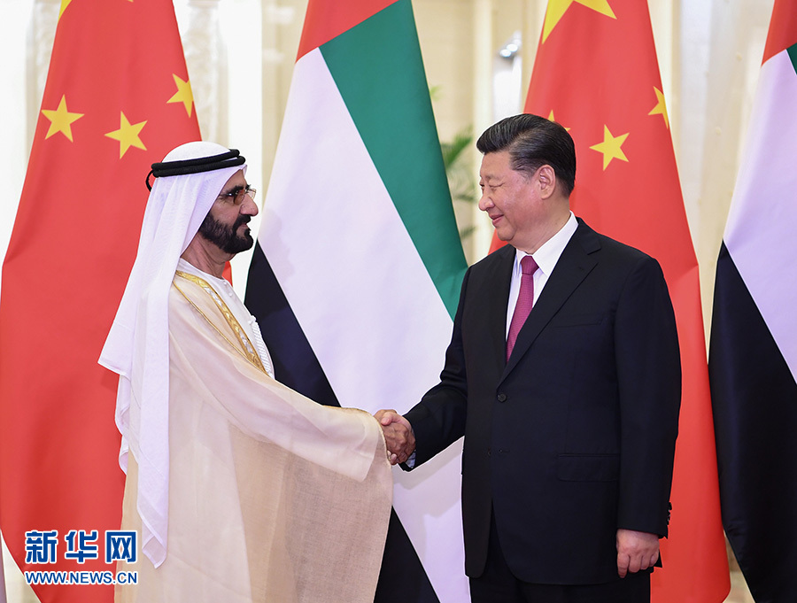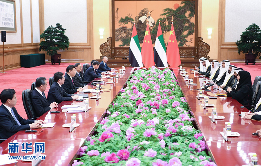 習(xí)近平指出,去年7月我訪問阿聯(lián)酋期間,兩國宣布建立全面戰(zhàn)略伙伴關(guān)系,揭開中阿關(guān)系發(fā)展新篇章。中方視阿聯(lián)酋為共建“一帶一路”的重要合作伙伴。雙方要穩(wěn)步推進(jìn)以能源合作為主軸、以投資和基礎(chǔ)設(shè)施建設(shè)為兩翼、以高新技術(shù)為增長點(diǎn)的務(wù)實(shí)合作。下階段要對(duì)接創(chuàng)新發(fā)展戰(zhàn)略,打造兩國合作新增長點(diǎn)。要深化打擊恐怖主義和極端勢(shì)力等安全領(lǐng)域合作,共同維護(hù)兩國和地區(qū)安全穩(wěn)定。副總統(tǒng)先生提出的“擁抱中國”計(jì)劃深受阿聯(lián)酋民眾歡迎,要不懈推動(dòng)兩國人文交流。中方支持阿方明年舉辦中東地區(qū)首屆世博會(huì)。