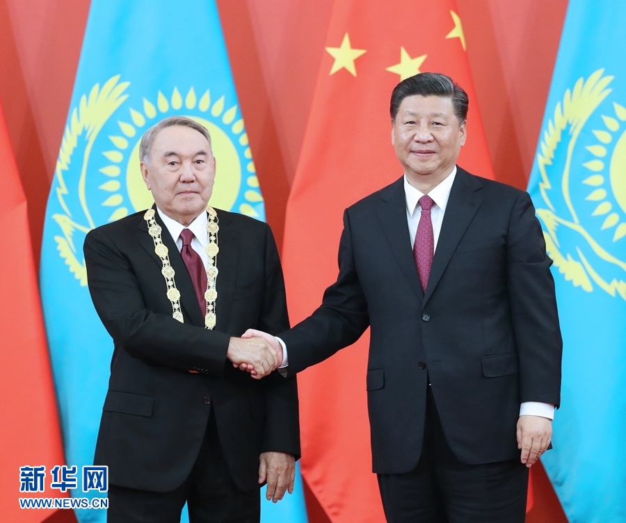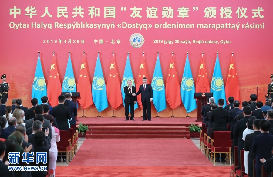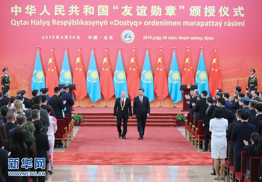 4月28日,國家主席習(xí)近平在北京人民大會(huì)堂中央大廳為哈薩克斯坦首任總統(tǒng)納扎爾巴耶夫舉行“友誼勛章”頒授儀式。新華社記者 姚大偉 攝