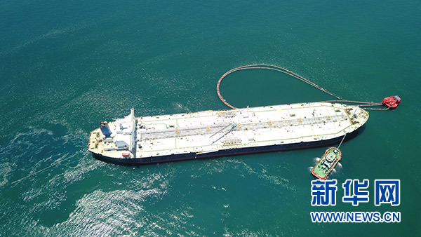 5月3日,一艘油輪在文萊海面上接卸恒逸石化大摩拉島綜合煉化項目所需原油(航拍照片)。 新華社發(fā)(恒逸實業(yè)供圖)