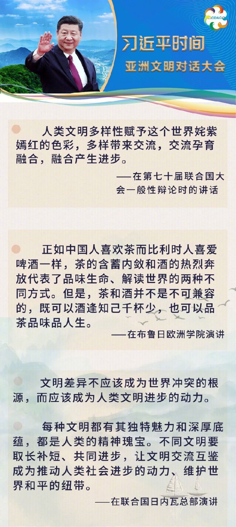 “中方倡議召開亞洲文明對(duì)話大會(huì),加強(qiáng)青少年、民間團(tuán)體、地方、媒體等各界交流,打造智庫(kù)交流合作網(wǎng)絡(luò),讓亞洲人民享受更富內(nèi)涵的精神生活,讓地區(qū)發(fā)展合作更加活力四射?!?/p>