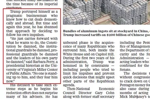 “他把自己描繪成一個務實的商人”,但是“他只是想做什么就做什么,憲法該死、制度該死、專業(yè)防護措施該死,”弗吉尼亞大學米勒公共事務中心的總統(tǒng)歷史學家芭芭拉·佩里說:“他所在黨派的領導人都很可惡,”“沒有人站起來對抗他,他們現(xiàn)在害怕他。”