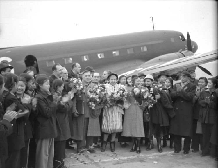 ↑應(yīng)邀參加“中蘇友好月”的蘇聯(lián)電影藝術(shù)工作者代表團(tuán)團(tuán)長(zhǎng)費(fèi)道羅夫一行、蘇聯(lián)藝術(shù)工作團(tuán)團(tuán)員烏蘭諾娃等藝術(shù)家抵達(dá)北京,在機(jī)場(chǎng)受到中國(guó)文化界、電影界人士熱烈歡迎。(1952年11月6日,袁浩)