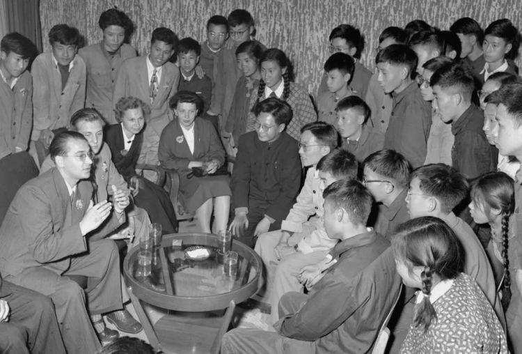 ↑共青團(tuán)員們?cè)谏虾Ee行聯(lián)歡會(huì),慶祝十月革命40周年。這是上海學(xué)生和蘇聯(lián)青年代表保爾·沙柯夫等交談。(1957年11月5日,楊溥濤)