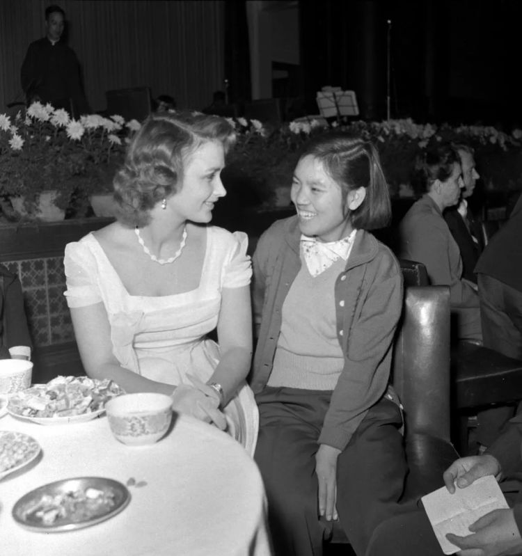 ↑北京舉行盛大聯(lián)歡晚會(huì),慶祝十月社會(huì)主義革命41周年。這是北京市紡織勞動(dòng)模范邢秀英和蘇聯(lián)女演員吉里英科在晚會(huì)上交談。(1958年11月4日,劉長(zhǎng)忠)