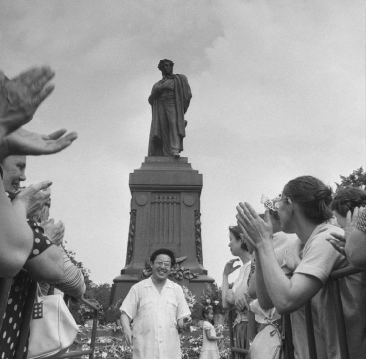 ↑莫斯科群眾歡迎一位中國(guó)老師用俄語(yǔ)和中文朗誦普希金的詩(shī)歌。 (1986年,伊戈?duì)枴ぷ艟?