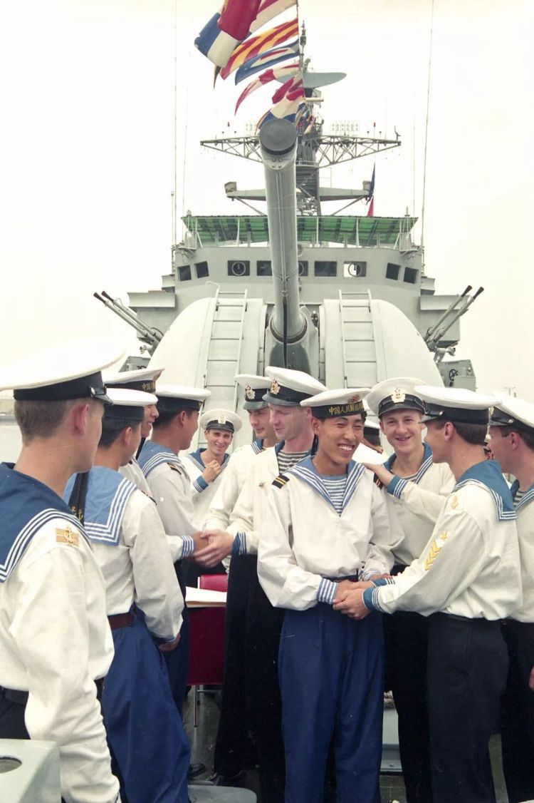 ↑正在山東青島進(jìn)行友好訪問的俄羅斯海軍太平洋艦隊(duì)官兵,來到中國(guó)海軍艦艇參觀,受到中國(guó)水兵的熱情歡迎。(1993年8月26日,新華社稿)