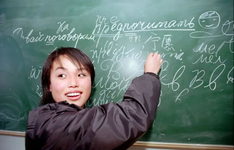 ↑中國(guó)滿洲里的一位老師在給學(xué)生上俄語(yǔ)課。 (2004年,葉夫格尼·葉潘欽采夫)