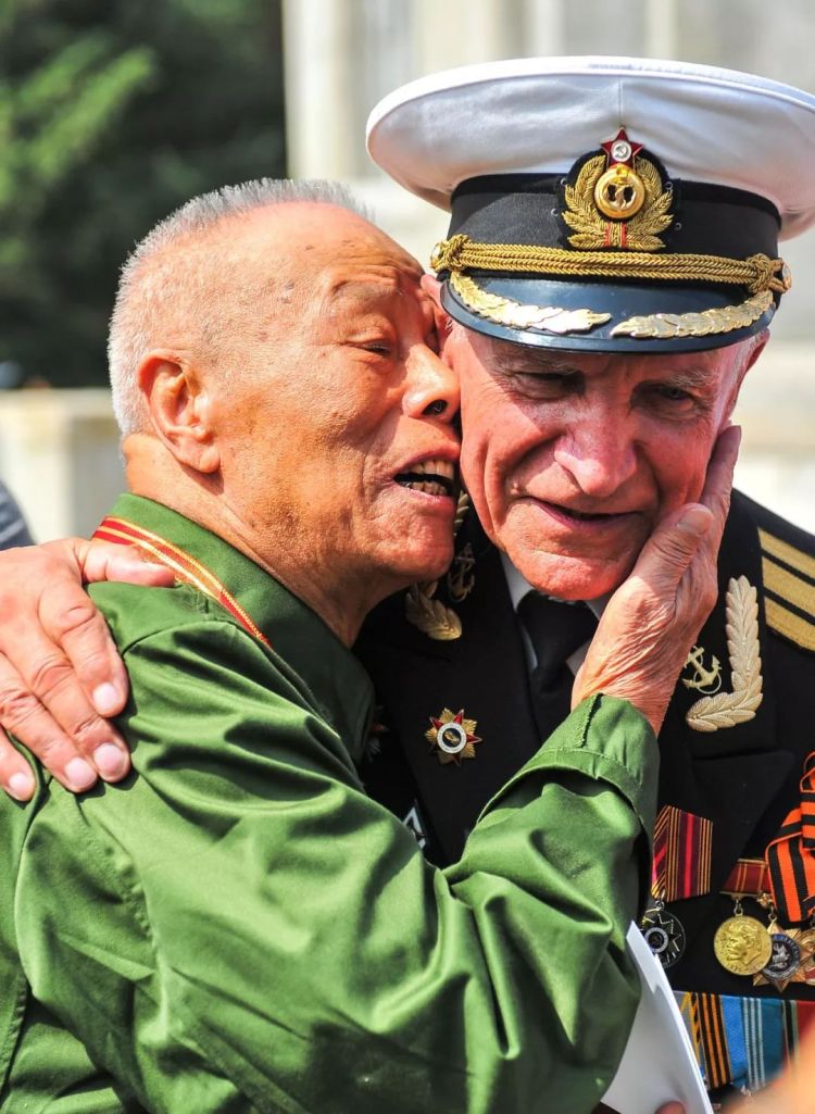 ↑吉林長(zhǎng)春,中俄雙方抗戰(zhàn)老戰(zhàn)士在祭奠蘇聯(lián)紅軍烈士活動(dòng)上相擁。(2015年9月2日,許暢)